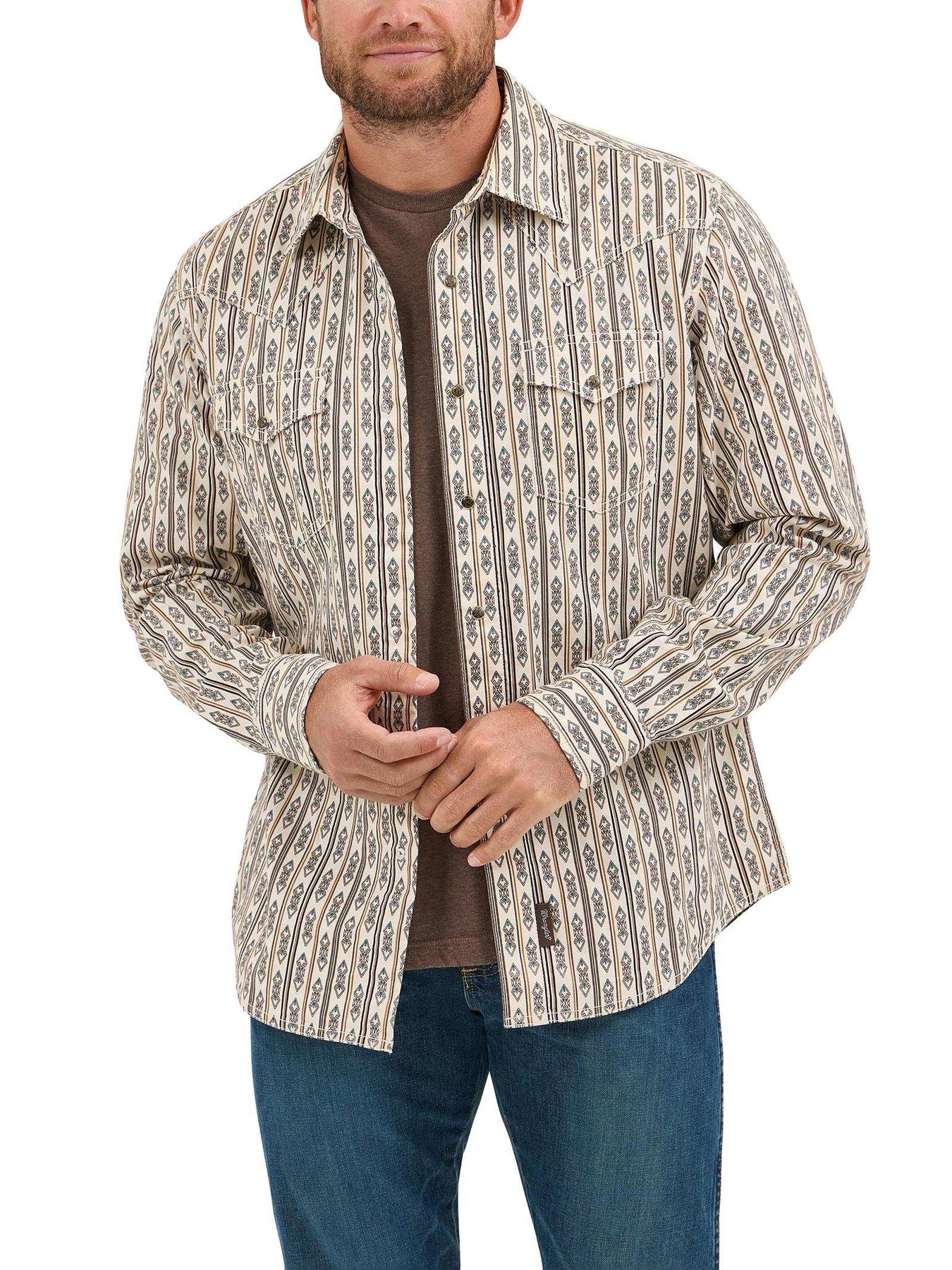 The Wrangler Retro® Long Sleeve Shirt - Modern Fit - Antique White Multi blends timeless Western design with a modern, tailored fit. Crafted for the cowboy who appreciates classic style with a contemporary edge, this shirt features a striking multicolor pattern on an antique white base. Snap closures, Western yokes, and double flap pockets stay true to Wrangler’s authentic roots, while the modern fit offers a clean, flattering silhouette.
